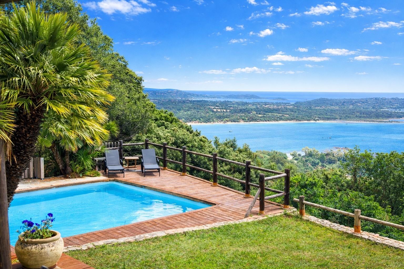 A l'extérieur, vous profiterez d'une incroyable vue panoramique sur la mer et le Golfe de Porto Vecchio depuis les terrasses et la piscine chauffée.