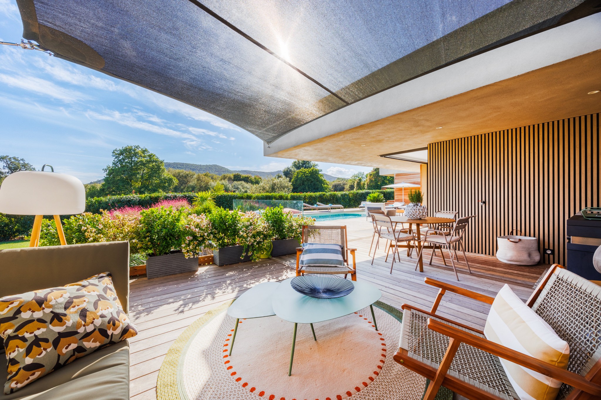 Elle se compose d'un espace de vie lumineux avec accès direct à une terrasse et à la piscine, d'une cuisine moderne entièrement équipée, de 4 chambres dont une indépendante avec chacune sa salle de bain.
