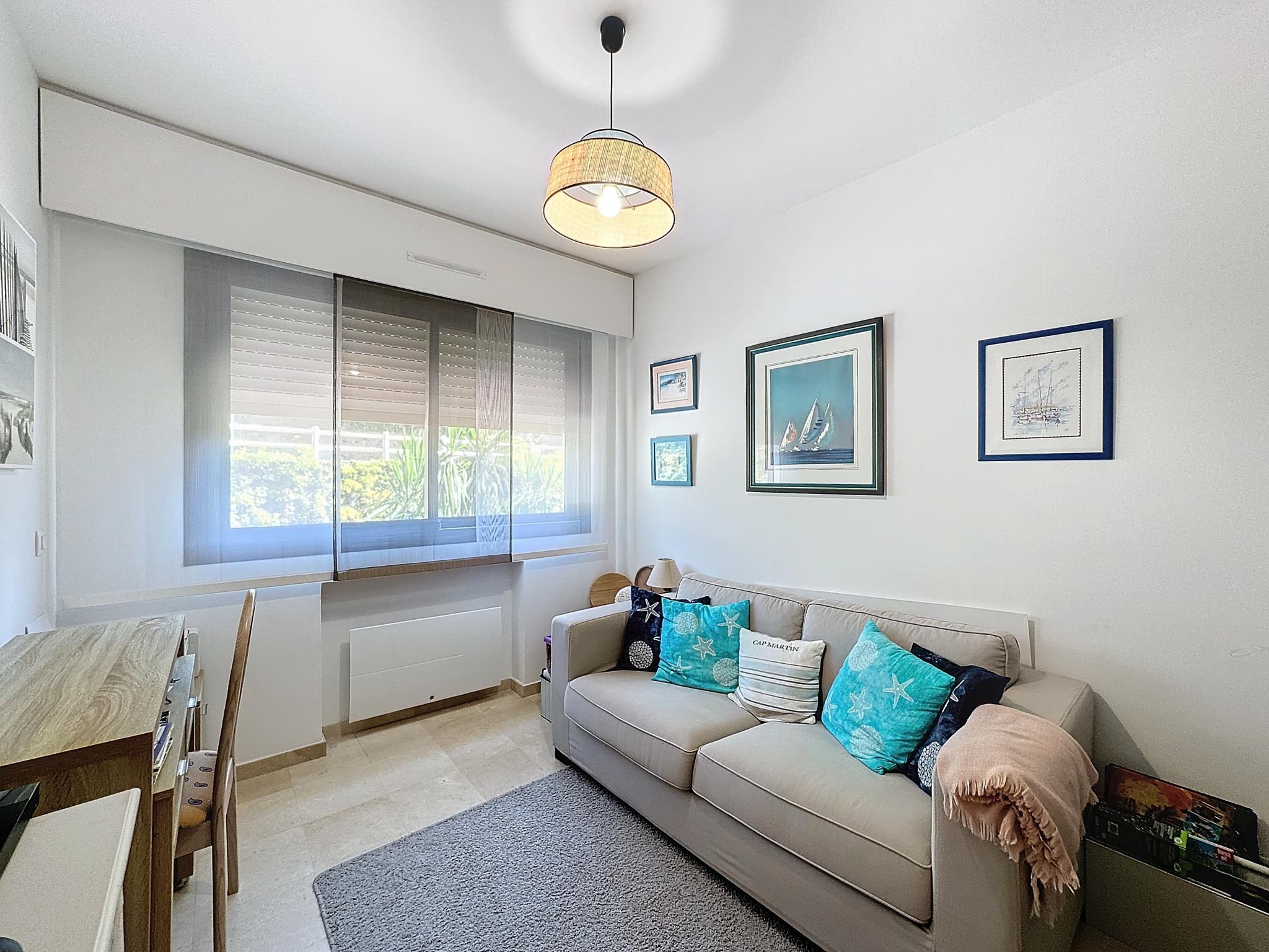 Baigné de lumière naturelle, il comprend une entrée, un vaste séjour avec salle à manger ouvrant sur une magnifique terrasse d'angle de 38 m², offrant une vue panoramique sur la mer jusqu'aux îles de Lérins. La cuisine indépendante est entièrement aménagée et équipée.