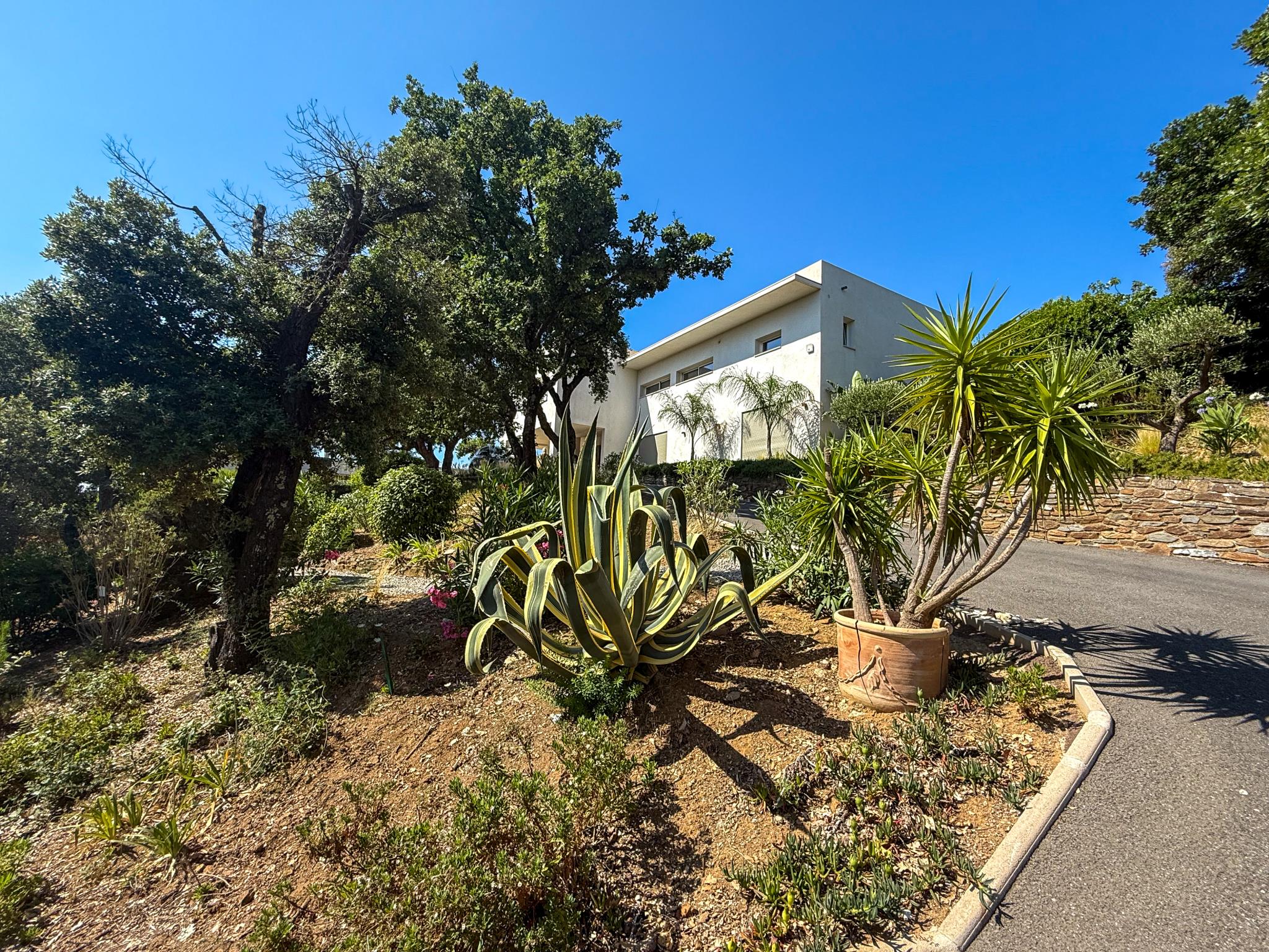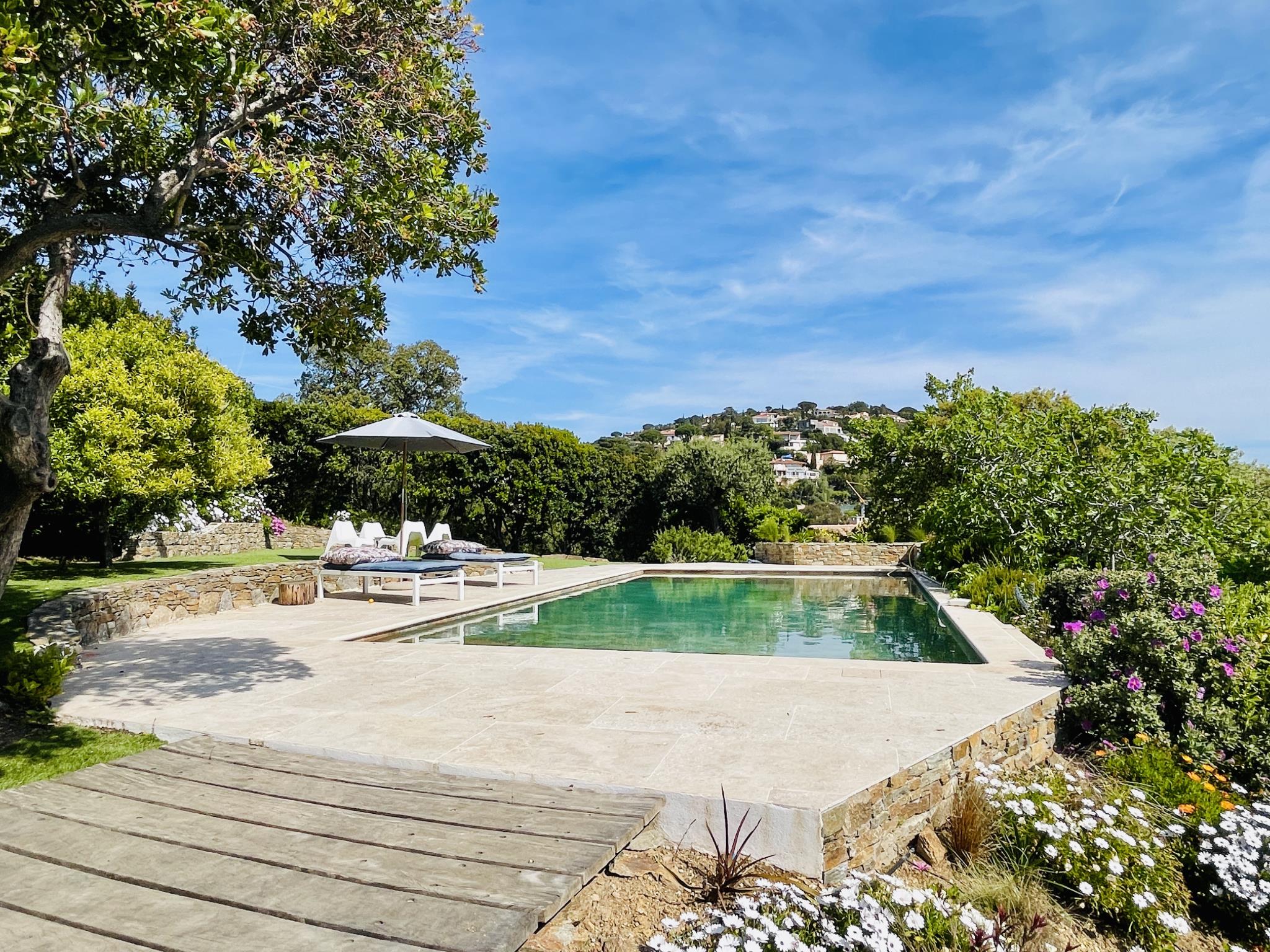 Le terrain de 2215m2 avec vue mer est arboré avec des essences méditerranéennes, à cela s'ajoute plusieurs terrasses, une belle piscine de 50m2.