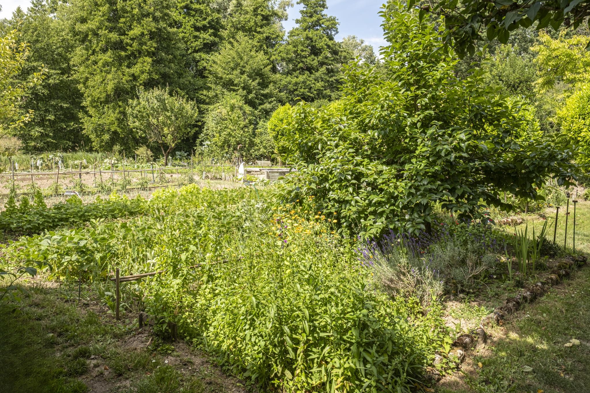 Garage fermé pour 3 voitures, hangar couvert pour 6 véhicules, cour pavée, potager, parc paysager, grange de 150m², cave, grenier, ancienne laiterie...