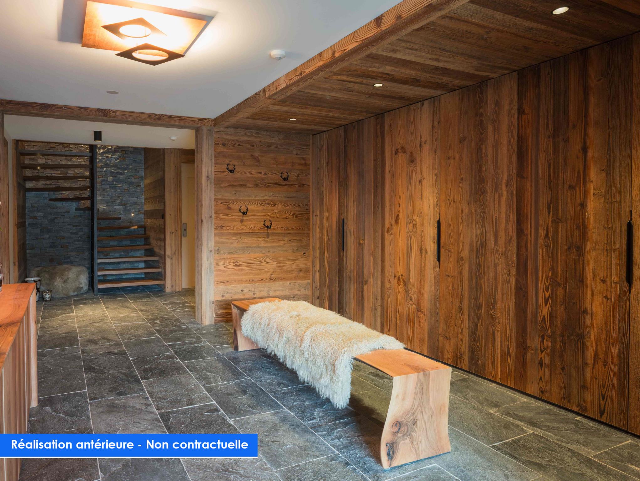 Les espaces annexes, fonctionnels et esthétiques, complètent ce bien d'exception : hall d'entrée généreux, rangements dédiés au matériel de ski, finitions boisées et éclairages subtils renforcent l'atmosphère cosy et luxueuse du chalet.
