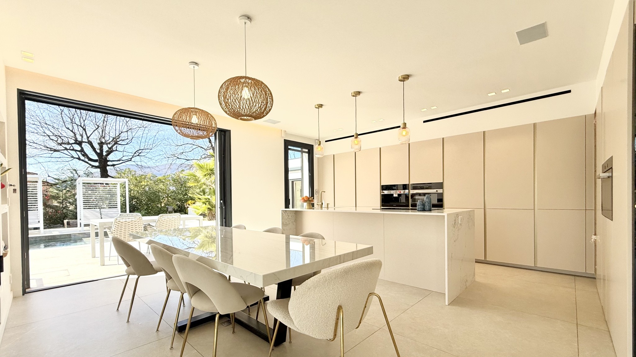 Nichée sur un terrain de 1500m², cette maison contemporaine, achevée en 2023, offre un cadre de vie à la fois moderne et résolument confortable. Le cœur de la villa s'ouvre sur un vaste espace de vie de 75m², prolongé par un poolhouse équipé d'un sauna, tandis que la piscine chauffée invite à la détente dès les premières heures du matin. La suite parentale de 28m² complétée par un dressing et une salle de bain avec baignoire et double douche, tandis que les trois autres chambres, dont un studio indépendant, offrent intimité et fonctionnalité. L'ensemble de la maison est doté d'une domotique complète, assurant un contrôle intelligent de l'éclairage, d'un plancher chauffant et rafraîchissant ,du chauffage et de la sécurité intérieur et exterieur.