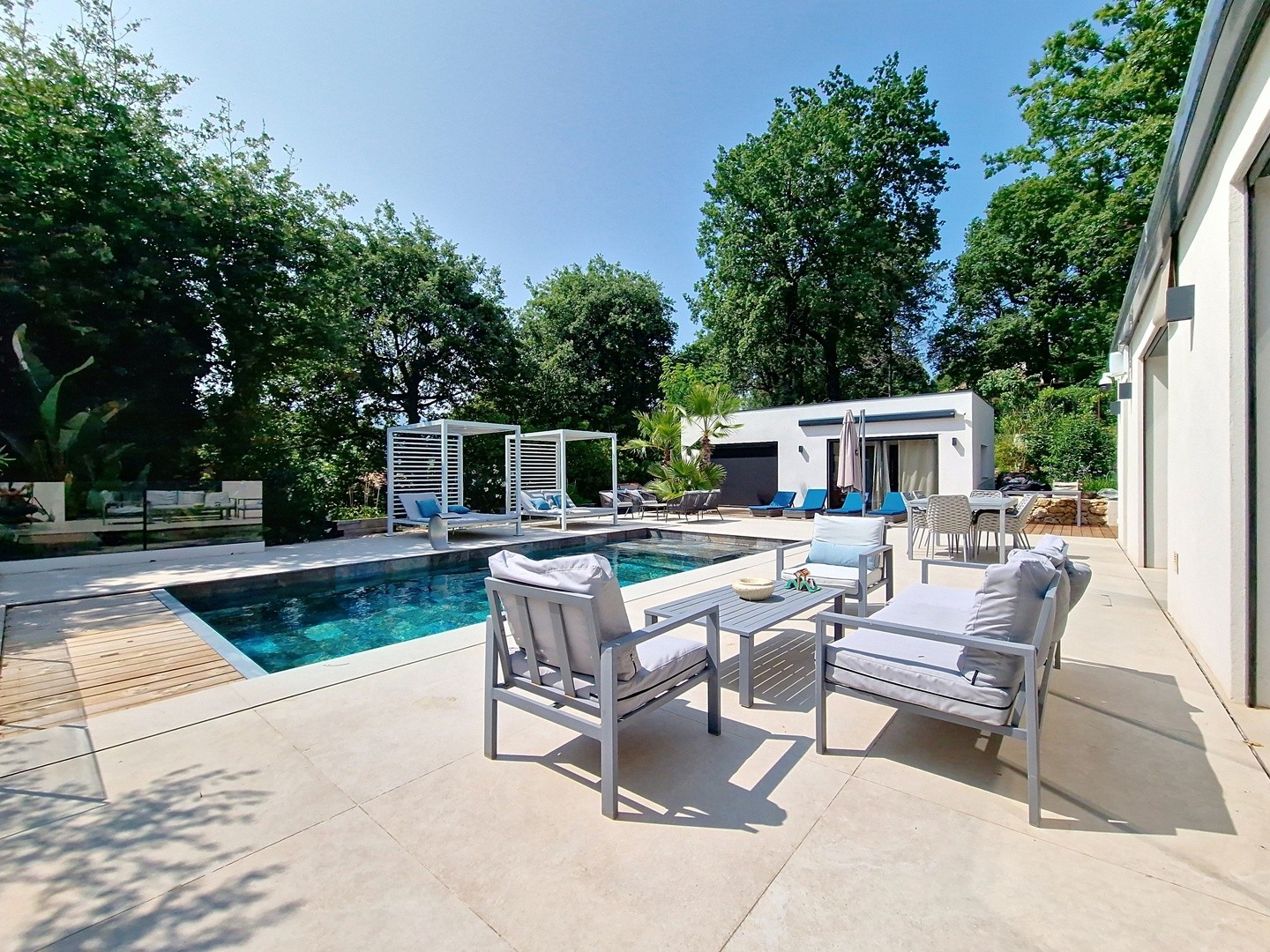 L'aménagement intérieur, combine espaces de vie généreux et zones de bienêtre. Des rangements soigneusement répartis répondent aux besoins quotidiens, tandis que le cellier et la buanderie facilitent l'organisation. Le jardin, véritable écrin de verdure, s'étend autour de la piscine et du poolhouse, offrant un espace privilégié pour les moments en famille ou entre amis.