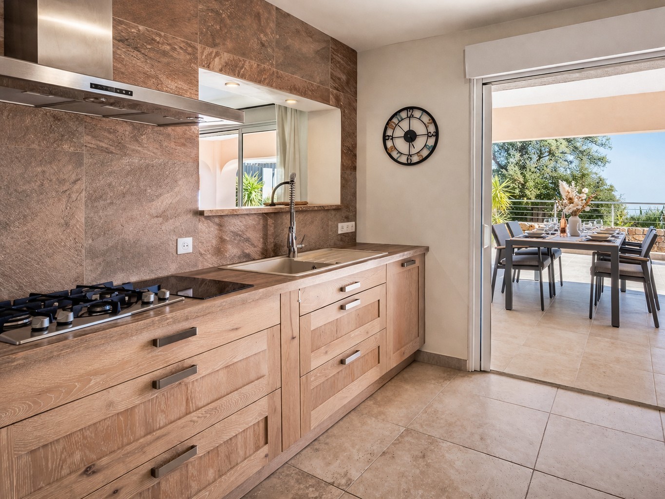 L'espace de vie, baigné de lumière et ouvert sur l'extérieur, propose un cadre de vie privilégié entre mer et montagne.