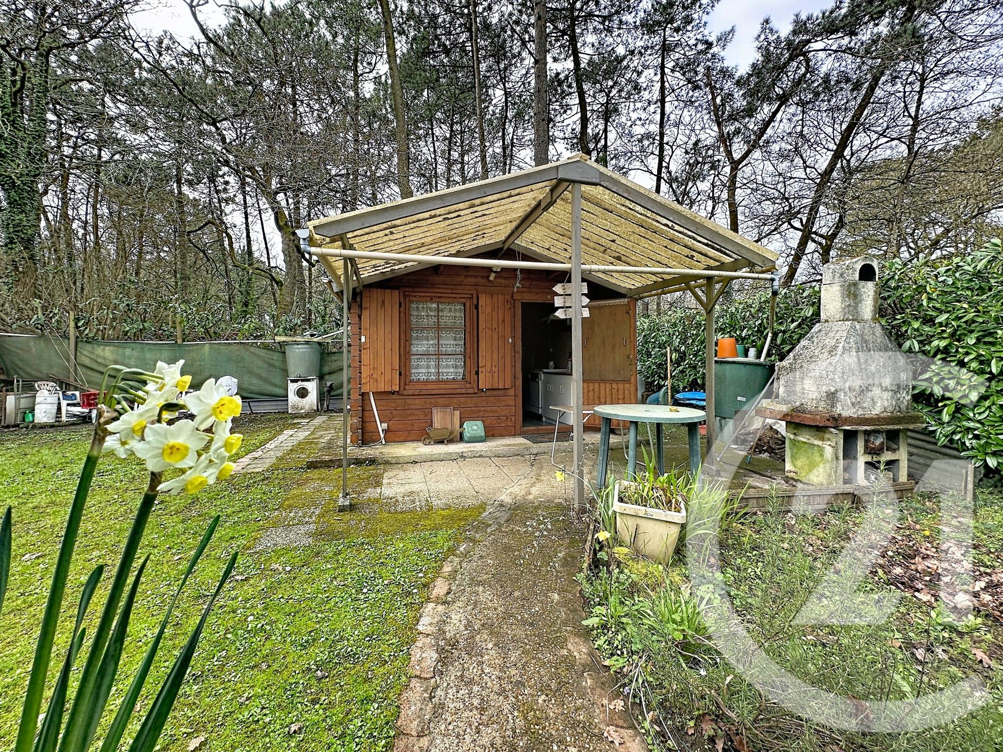 Ce terrain de loisirs vous offre un abri de jardin avec point d'eau et électricité, et, en annexe, une salle d'eau avec WC raccordé au tout à l'égout. Un auvent couvert abrite une caravane qui permettra d'avoir un espace supplémentaire.