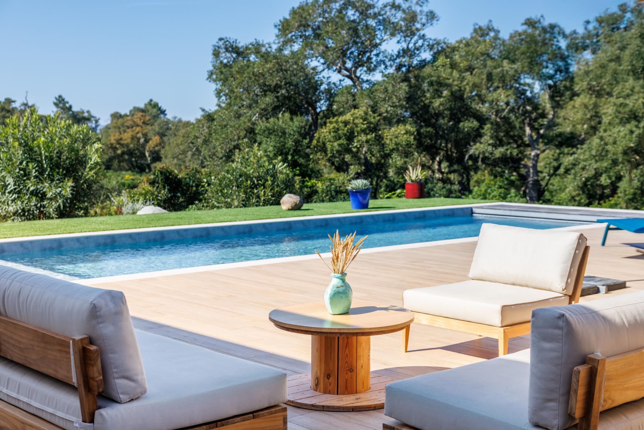 Cette villa est une véritable invitation au lâcher-prise, grâce à sa piscine privative entourée d'une spacieuse terrasse équipée de salon de jardin extérieur donnant sur le maquis Corse.