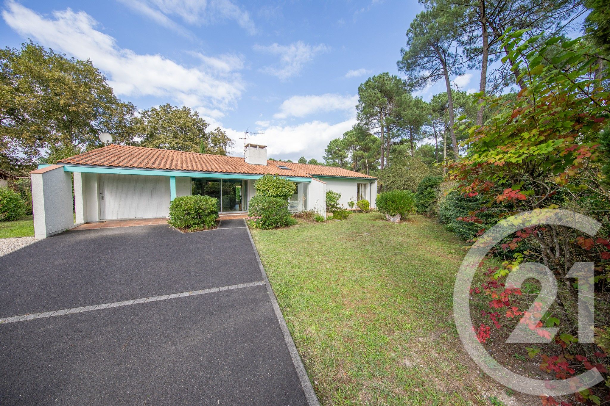 À l'extérieur, un véritable esprit de vacances vous attend sur une parcelle de 749 m², bordée de grands pins et donnant directement sur la piste cyclable. La terrasse, sans vis-à-vis, promet de beaux moments de détente en toute intimité.