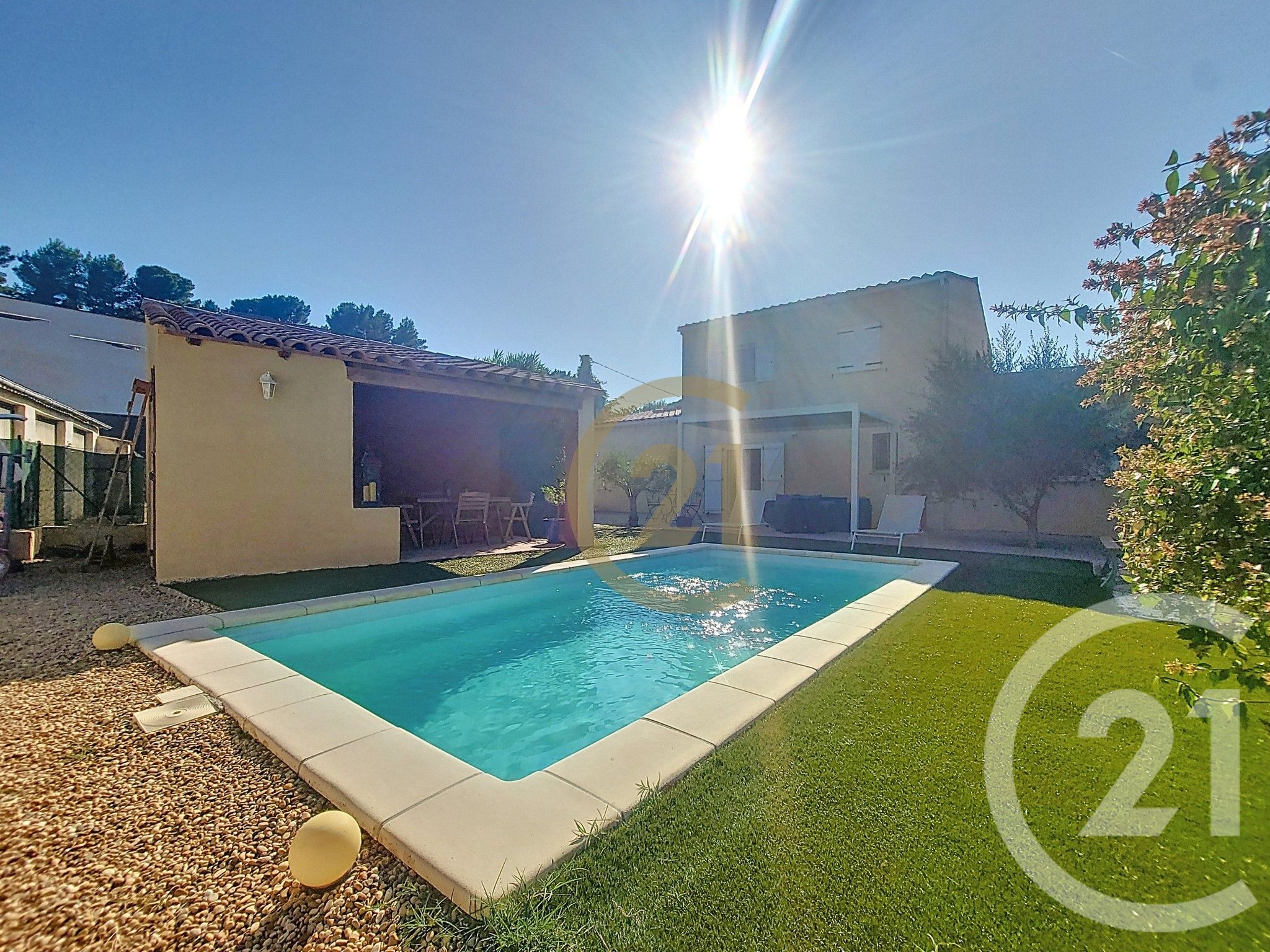 À l'extérieur, sur une parcelle d'environ 550 m², vous profiterez d'un bel espace paysager sans entretien, agrémenté d'une piscine et d'une cuisine d'été conviviale, parfaite pour profiter des belles journées en toute sérénité.