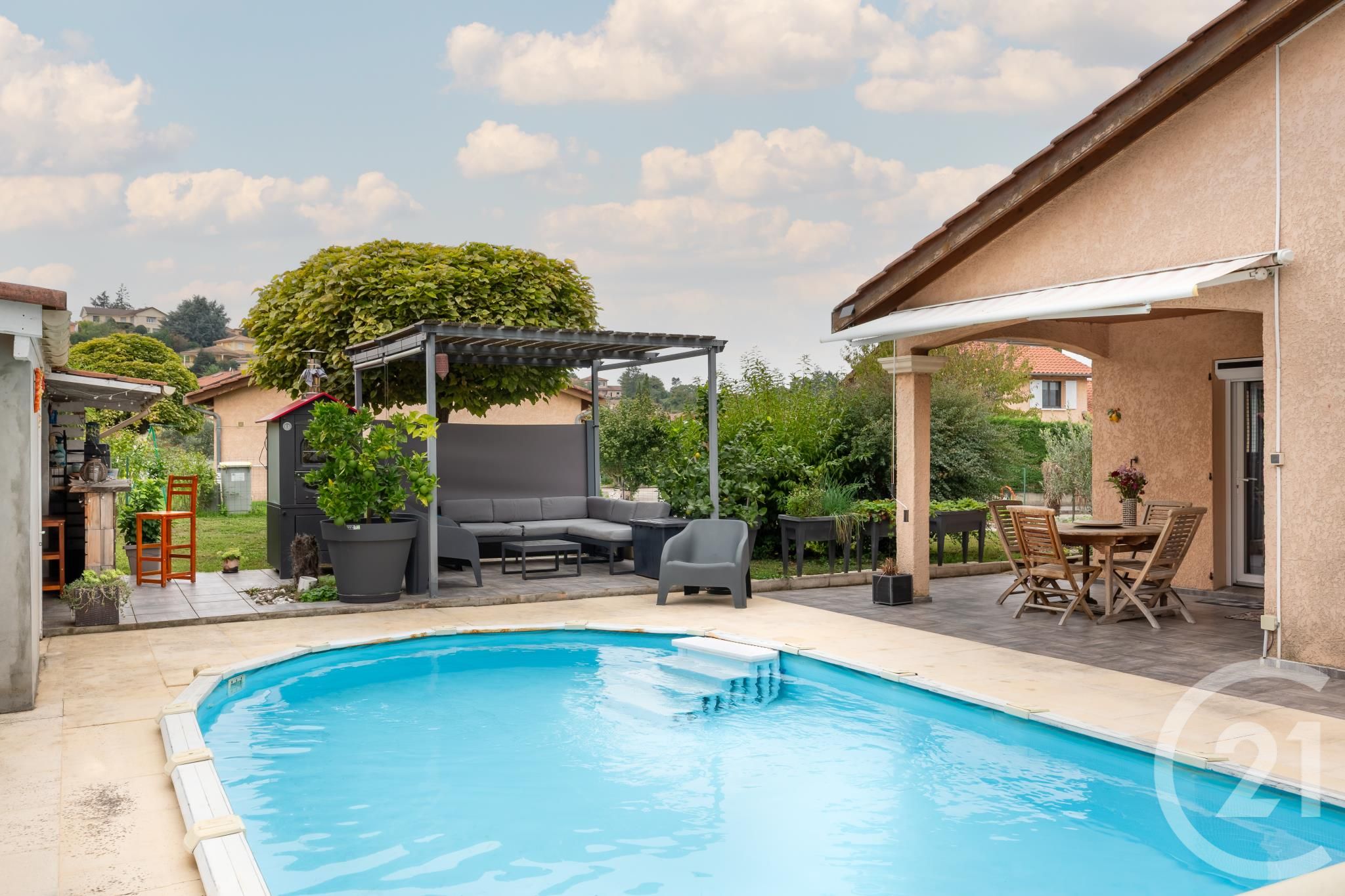 À l'extérieur, profitez d'une belle piscine, d'une grande terrasse et d'un jardin spacieux sur une parcelle de plus de 800 m². Le confort est garanti grâce à une chaudière gaz, une climatisation réversible, un poêle à bois, et une borne de recharge pour voiture électrique.