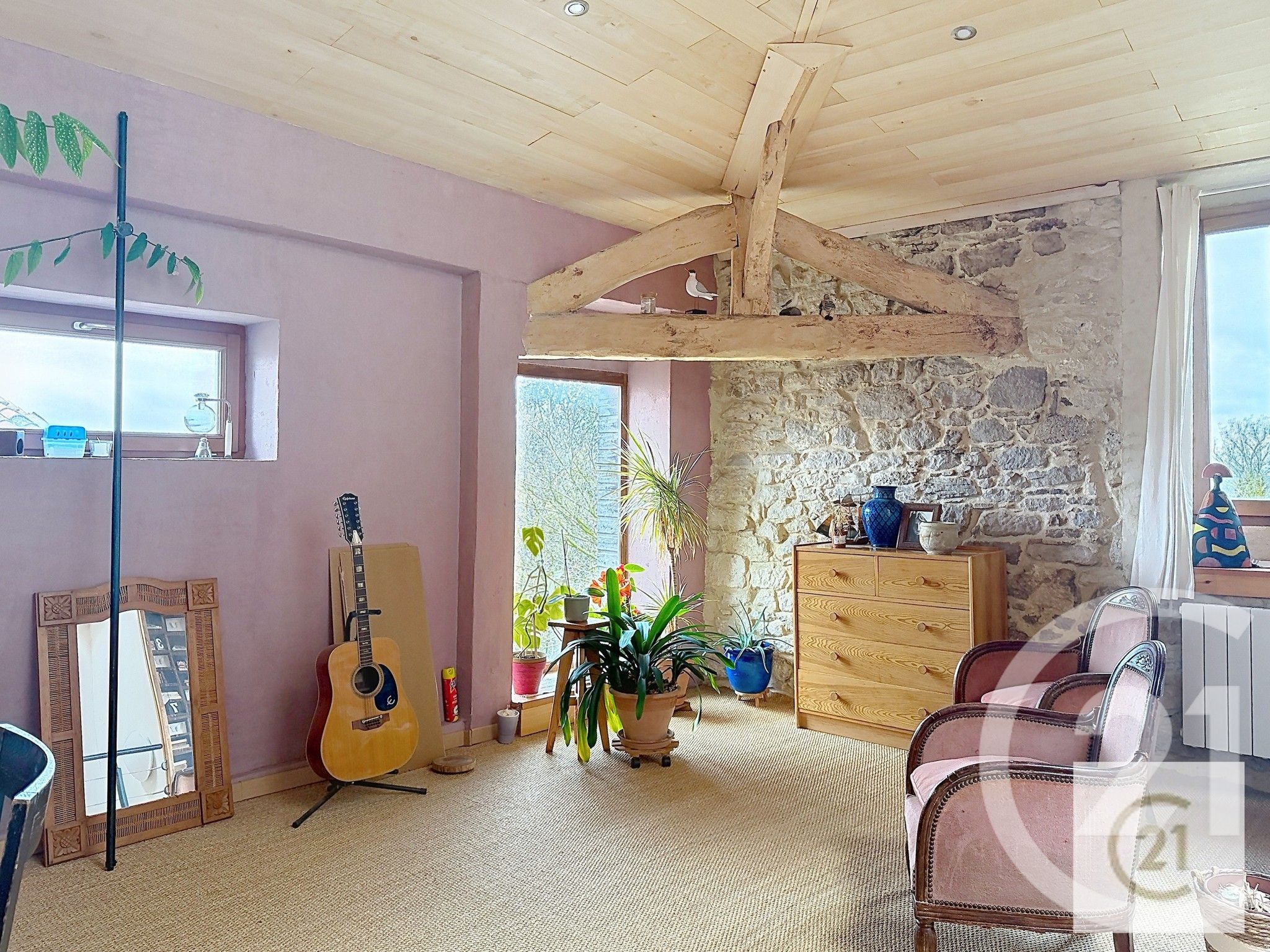 - Cheminée, double vitrage, placards, poutres
