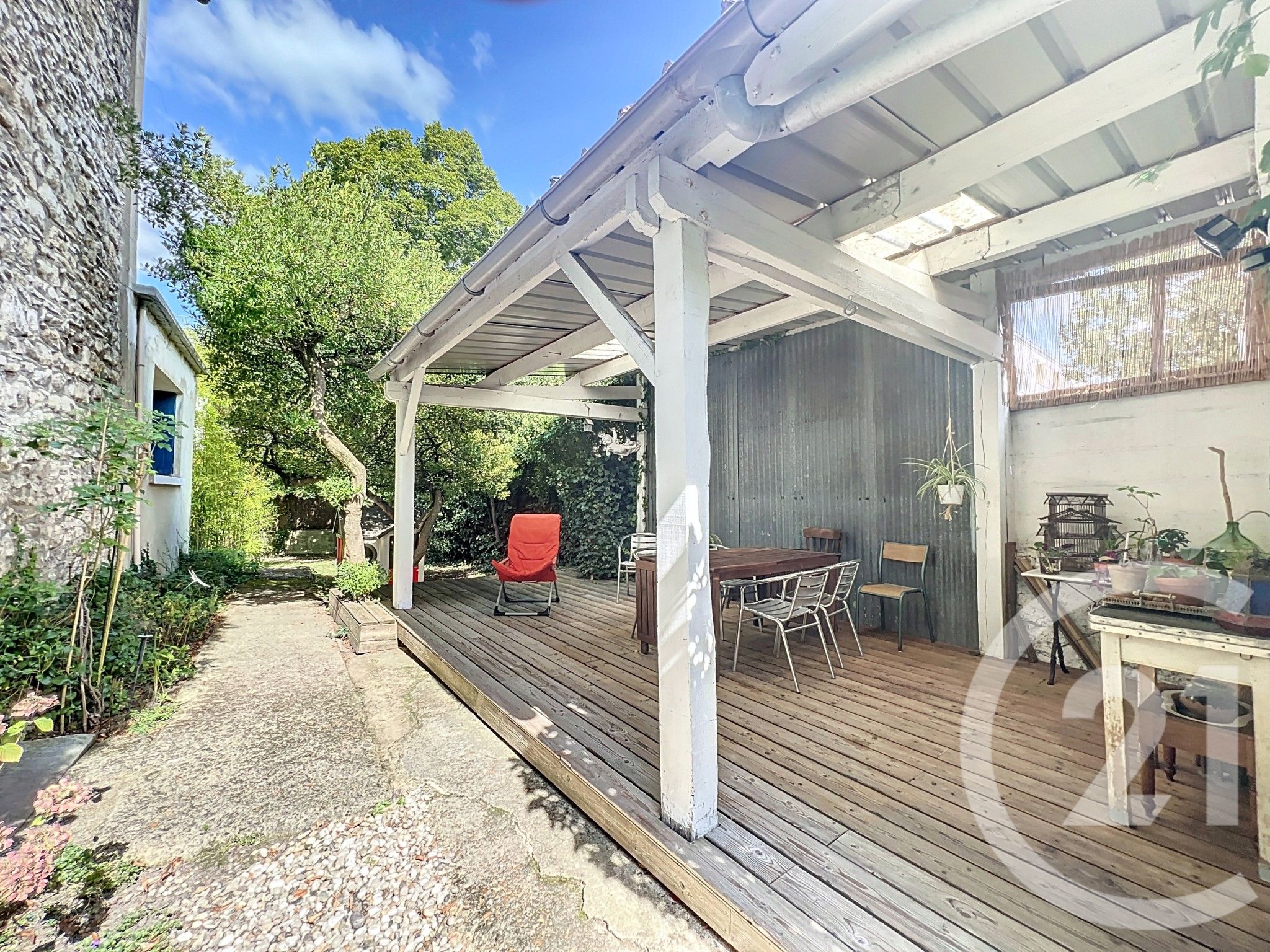 Jardin clos de murs de pierre et arboré, cet espace vous offre un préau face à la maison pour de bons moments de détente en famille.