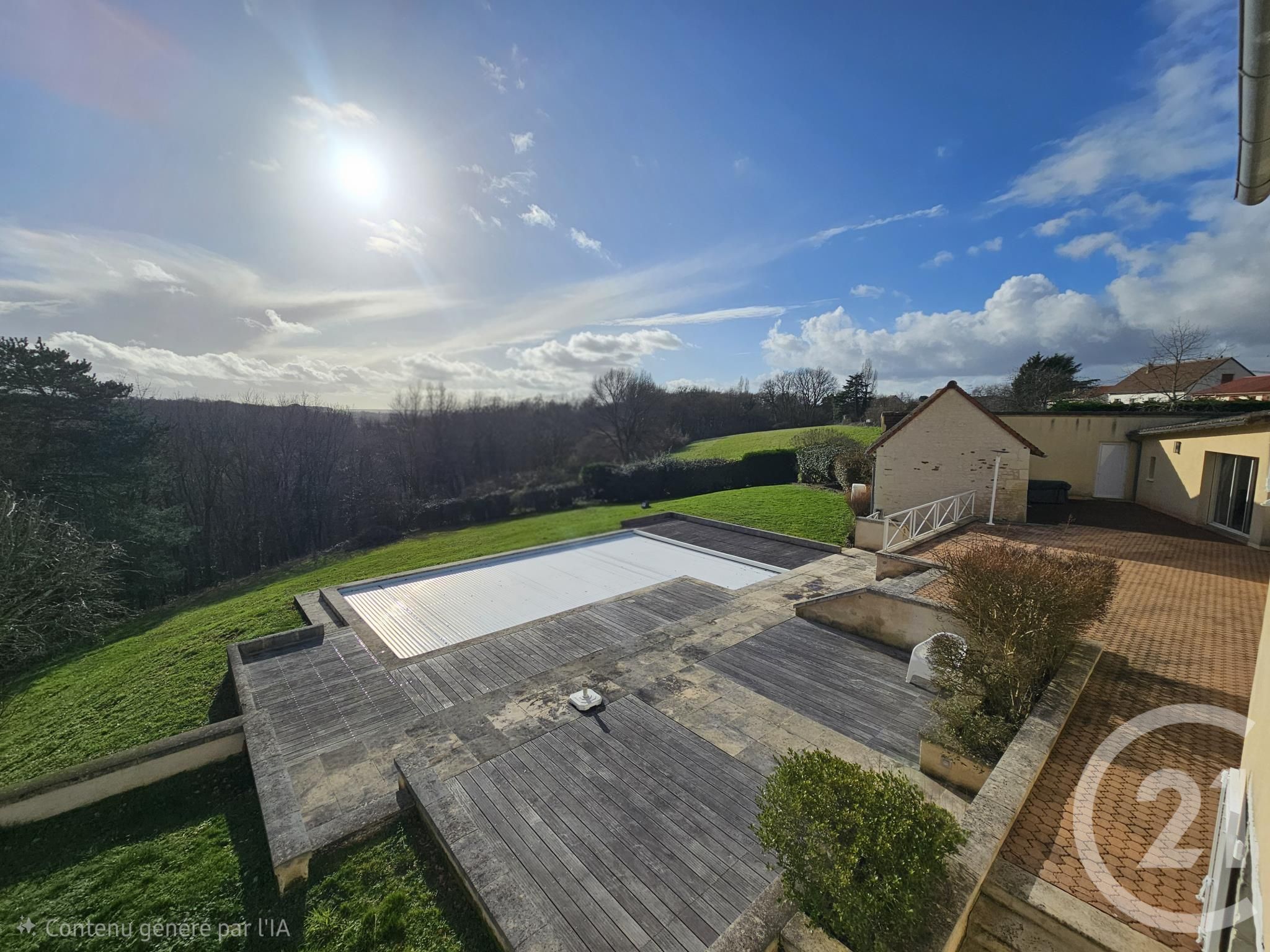 Coté jardin, pour profiter du soleil vous disposerez d'une grande terrasse et d'une piscine piscine 5x10 m chauffée par une pompe à chaleur et sécurisée par un volet roulant électrique.