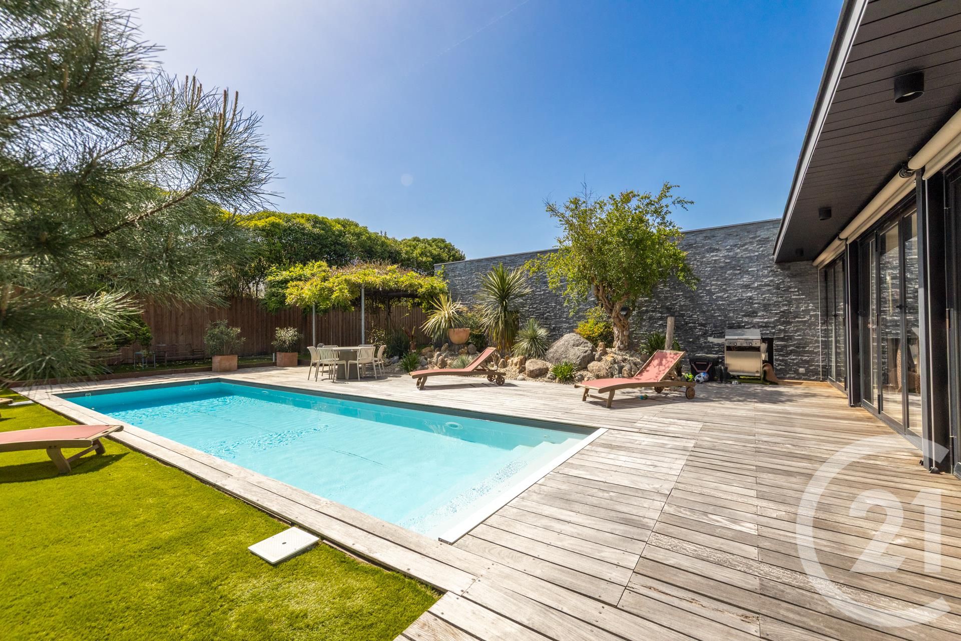 À l'extérieur, le jardin devient un lieu de vie à part entière. Terrasses couvertes, cuisine d'été, boulodrome, espaces de détente et piscine chauffée, composent un décor propice aux moments partagés.