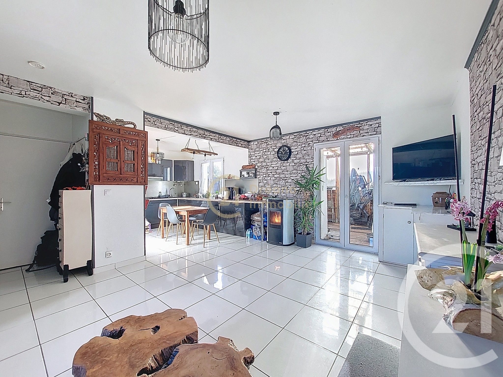 Dès l'entrée, vous découvrirez une pièce de vie umineuse, composée d'un salon-séjour avec son poêle à granulés, ouvert sur une cuisine aménagée et équipée.