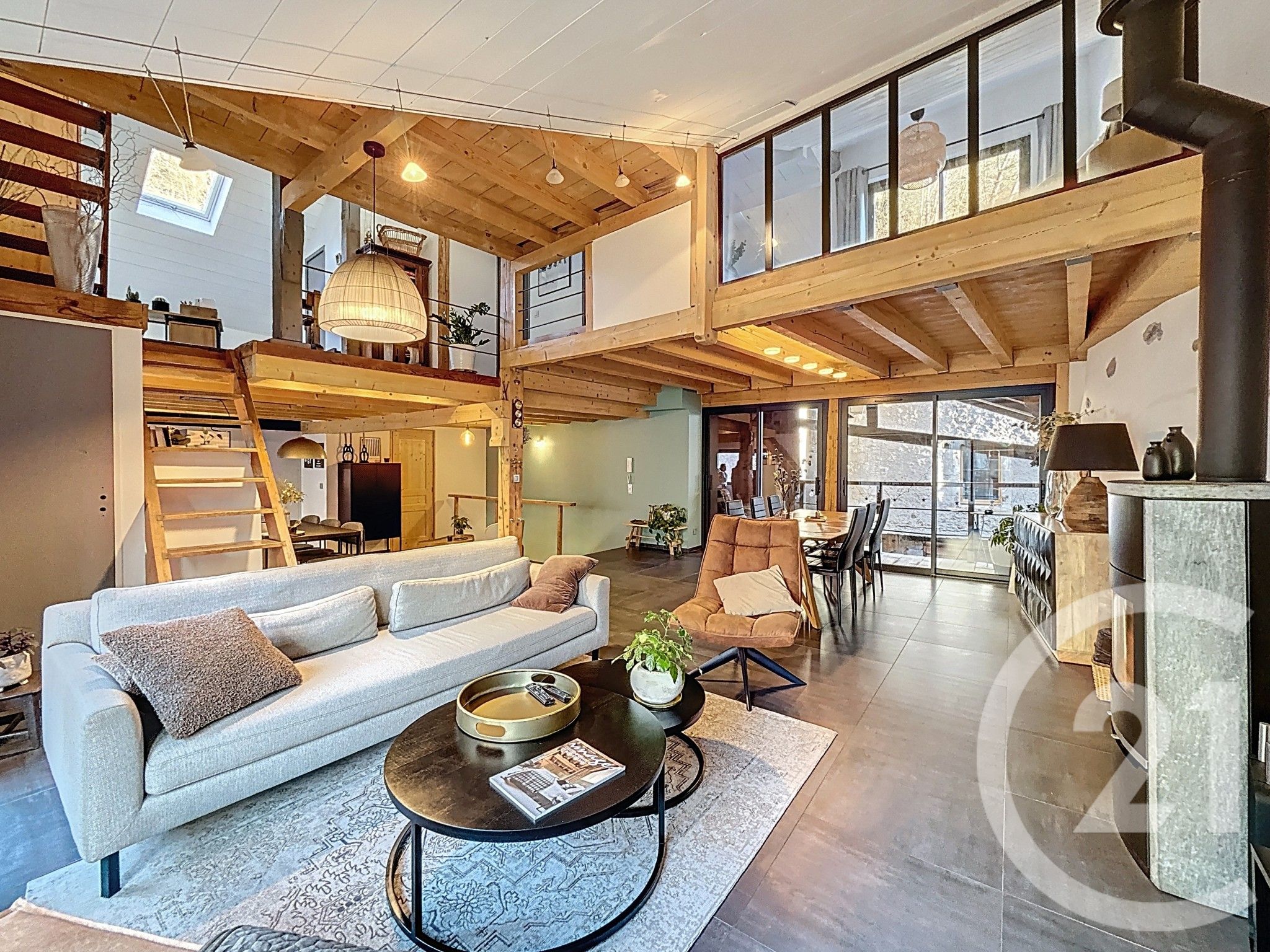 From the moment you step into the living area, the charm is immediate: exposed beams, warm wood, abundant natural light and refined finishes create an atmosphere that is both elegant and welcoming. The main living space, with its impressive ceiling height and beautiful proportions, features a cosy lounge and a convivial dining area, opening onto a high-end contemporary open-plan kitchen with central island, designed as a true place for sharing.