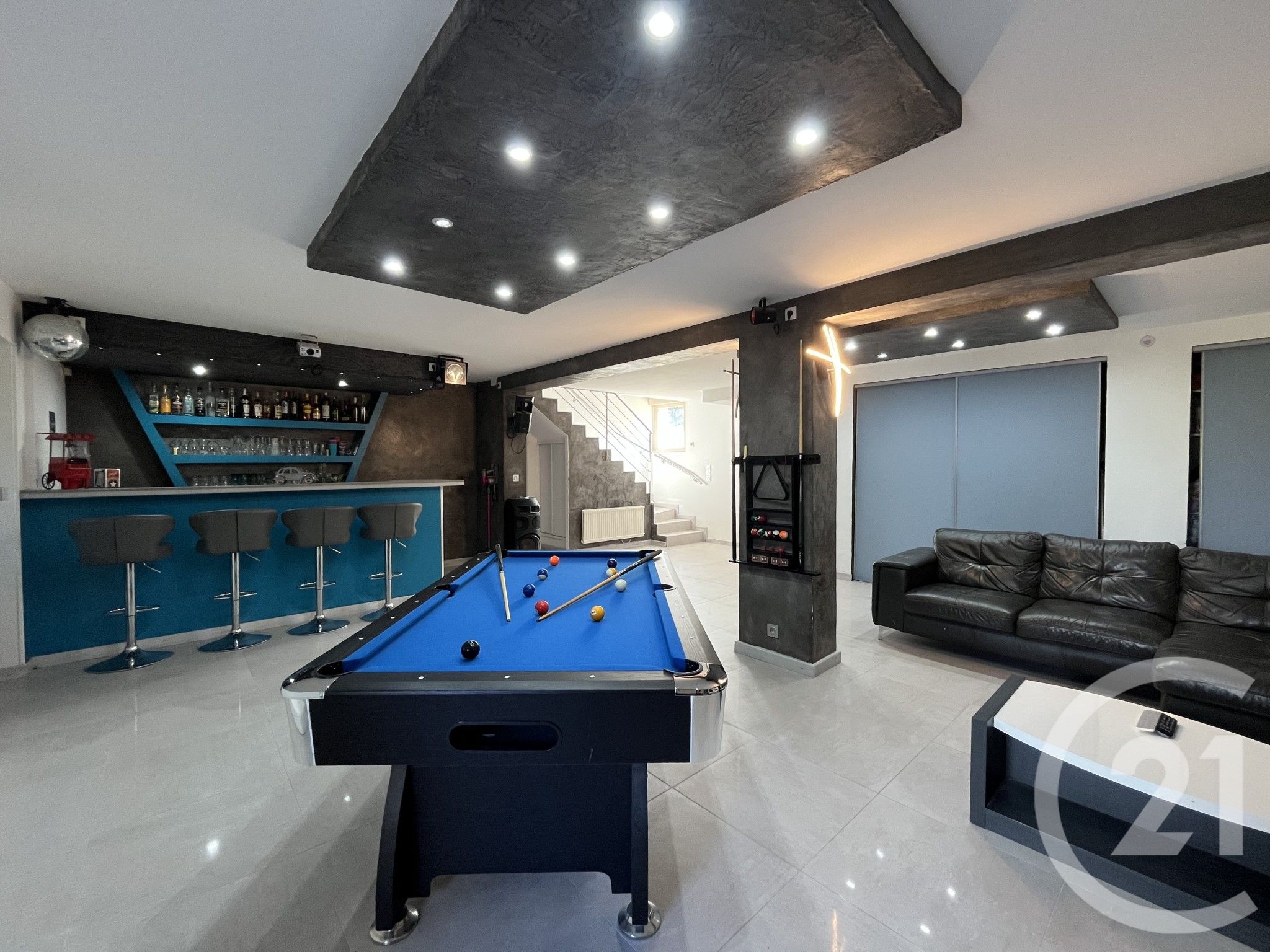 Sur près de 200m² habitables, elle offre 5 chambres dont une suite parentale, une vaste pièce de vie de plus de 50m², ainsi qu'un espace détente actuellement aménagé en salle de réception ( bar , billard, home cinéma...)de plus de 63m².