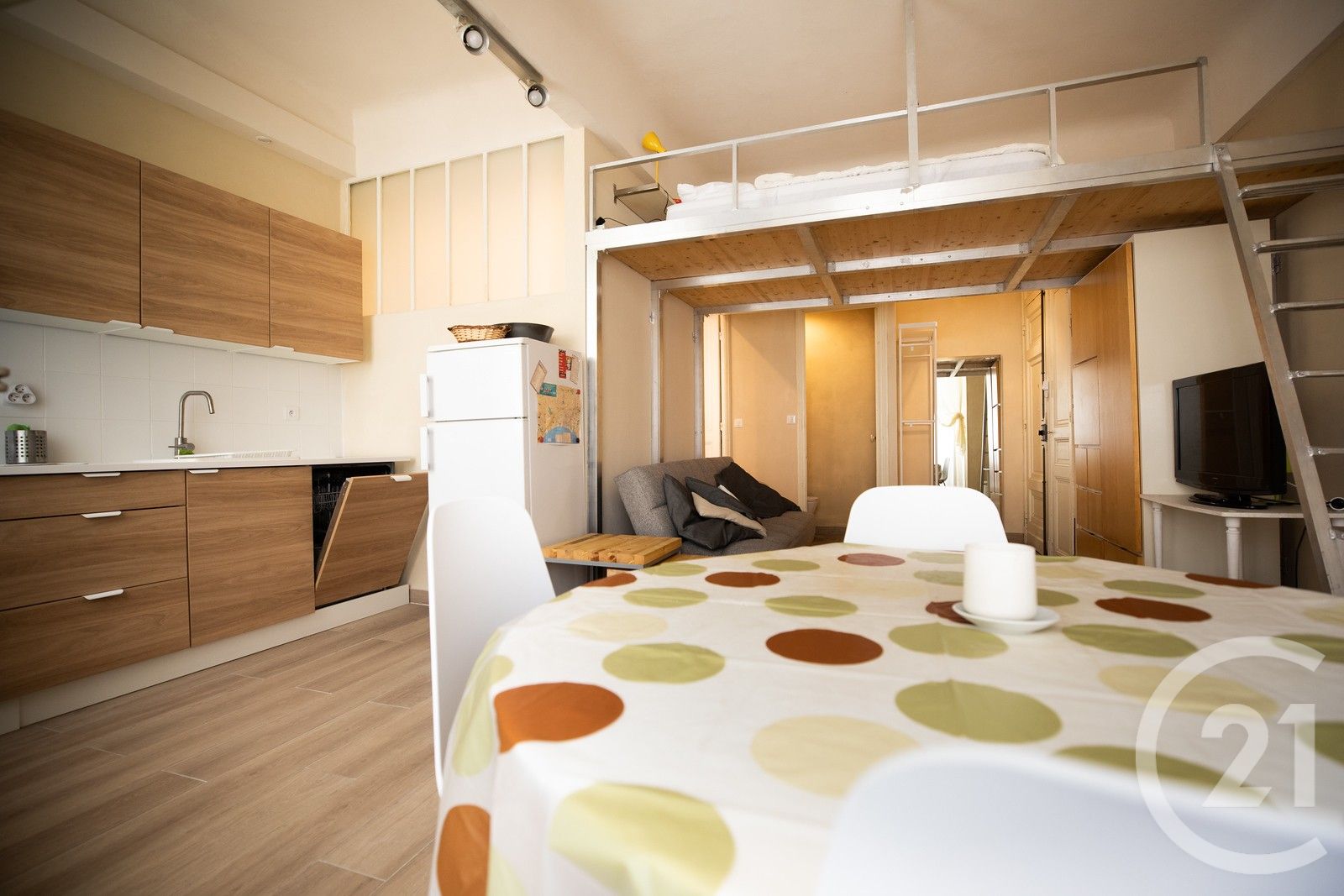 L'appartement se compose d'un séjour avec une mezzanine, une cuisine ouverte entièrement rénovée, aménagée et équipée, une salle d'eau avec douche à l'italienne et un WC indépendant (et machine à laver).