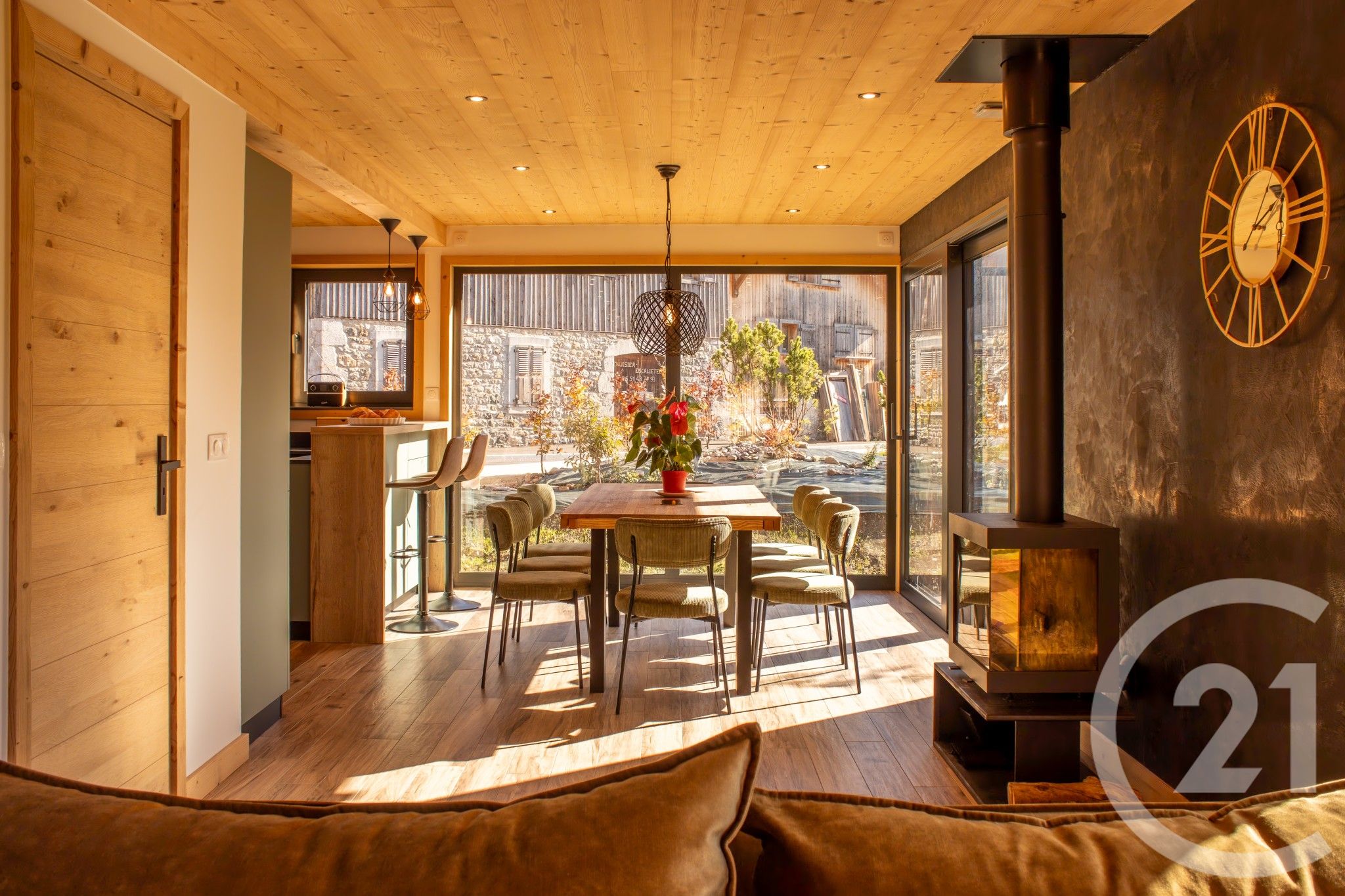 A wood-burning stove completes the chalet's warm atmosphere.