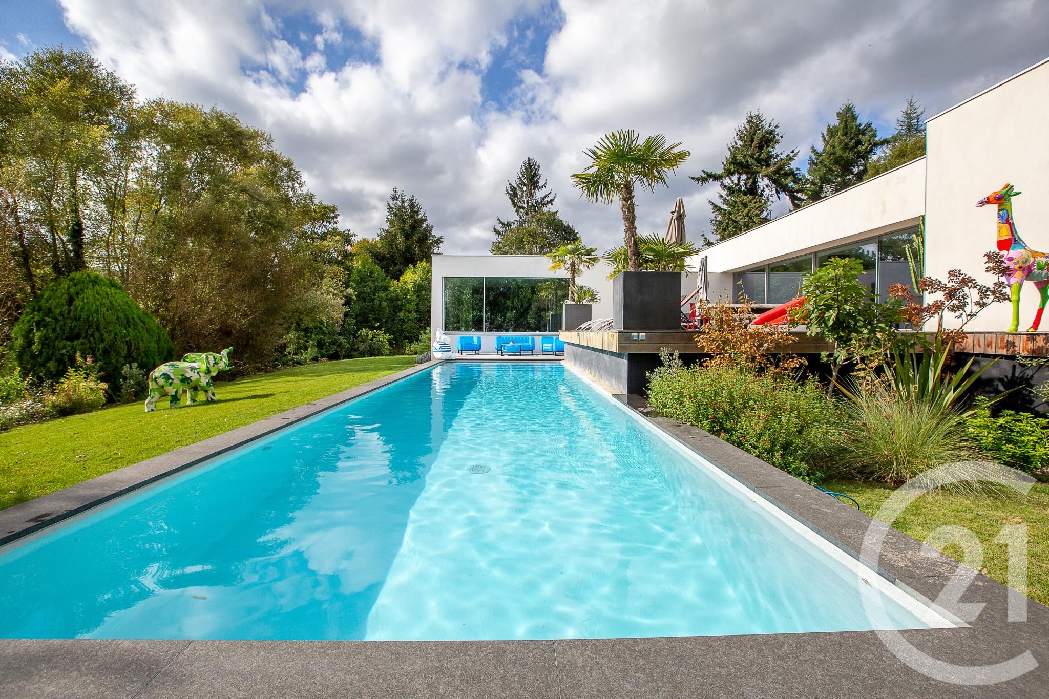 La villa, aux vastes volumes, propose une réception de plus de 100 m2, 5 vastes chambres avec salle de bains privatives, salle de jeux mais également un espace terrasse avec piscine contemporaine chauffée sur un terrain paysager de 2 223 m2.