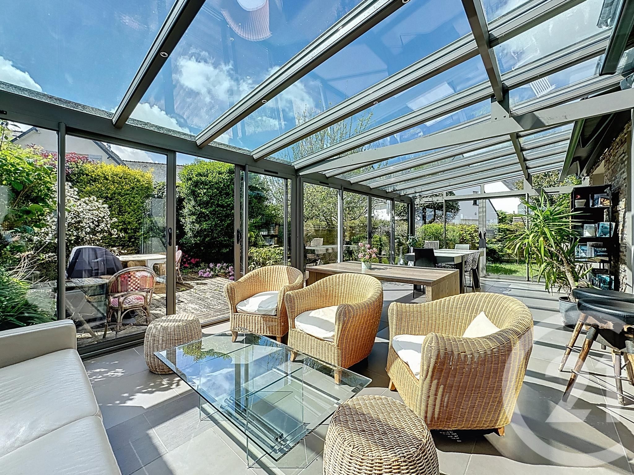 La véranda de 33 m², véritable espace de vie baigné de lumière, prolonge harmonieusement la maison et invite à la détente en toute saison.