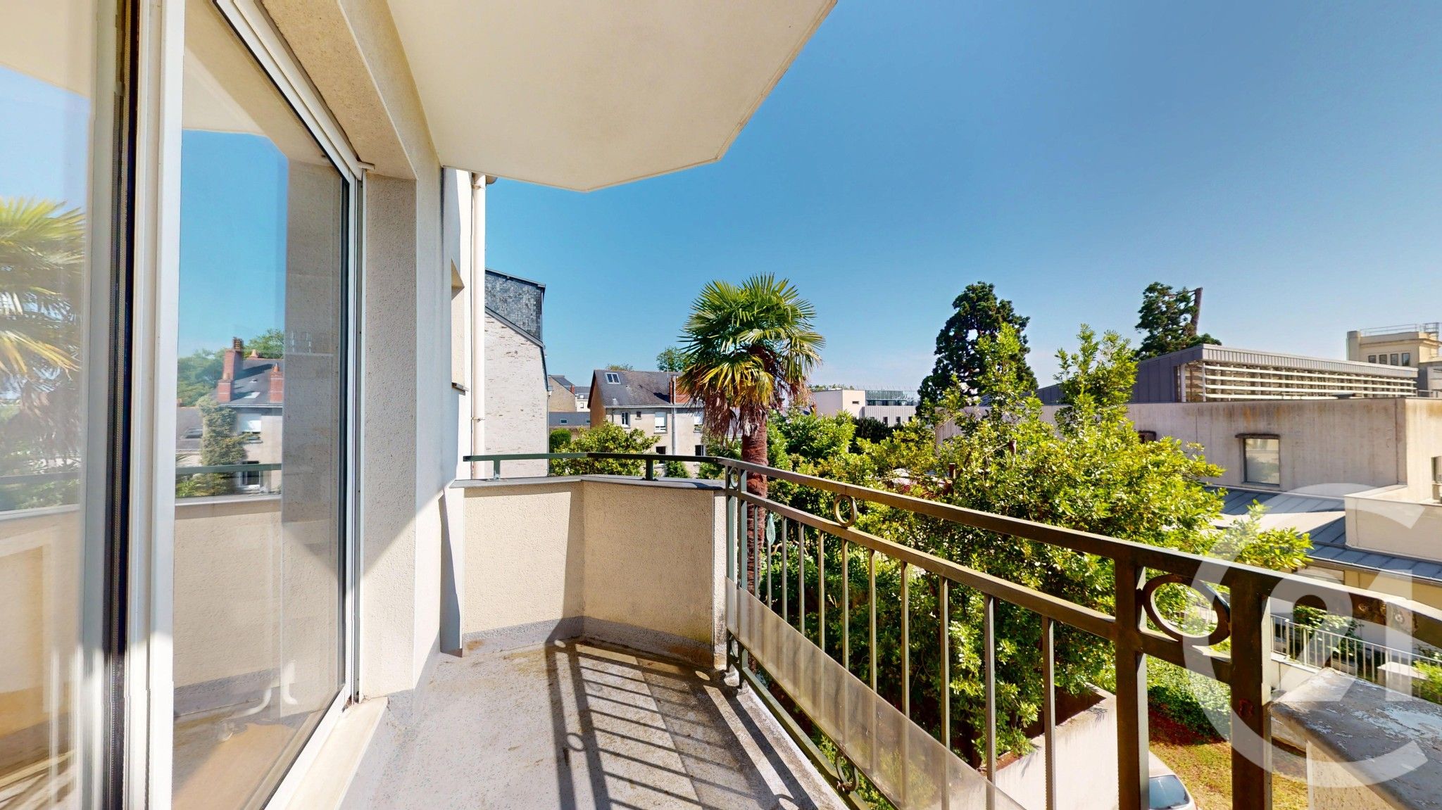 La pièce de vie est bien exposée sur un balcon spacieux dans un cadre arboré.