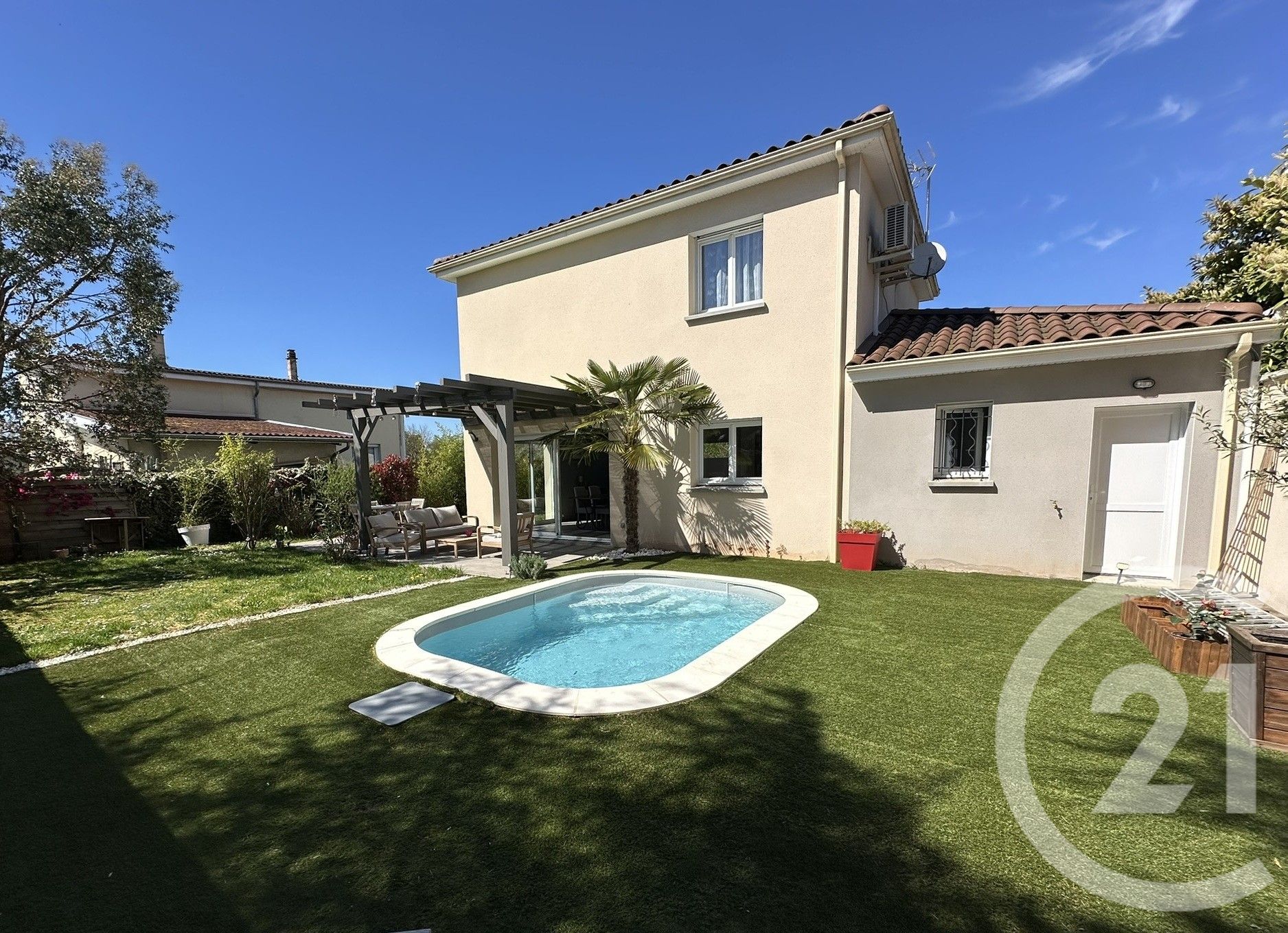 A l'extérieur, vous profiterez d'un jardin avec piscine simple d'entretien et terrasse en L pour un espace détente et repas distincts.