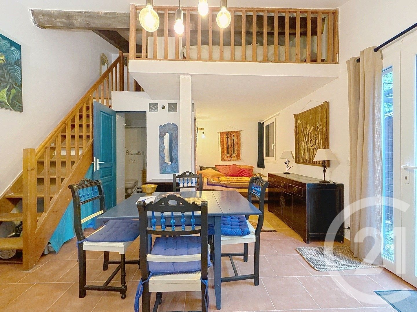 Elle se compose d'une pièce principale avec un coin nuit, d'une cuisine aménagée et équipée, ainsi que d'une salle de douche avec WC. À l'étage, une mezzanine vient compléter l'espace de vie.