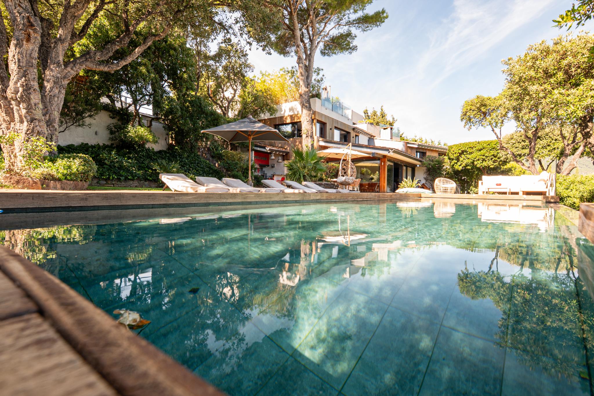 La maison principale offre 5 chambres, un vaste séjour baigné de lumière grâce à de grandes baies vitrées, ouvrant sur un jardin plat paysagé avec piscine et vue mer panoramique sur la baie.